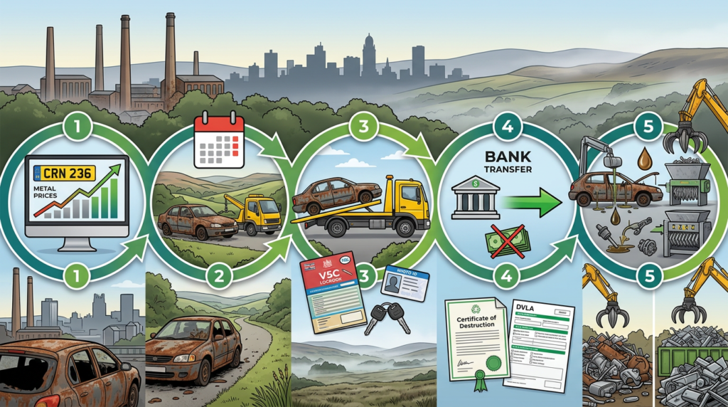 Clear your personal belongings, have your V5C and ID ready, and cancel your insurance after not before collection. For a full checklist, see our guide on How to Prepare Your Car for Scrap Collection.